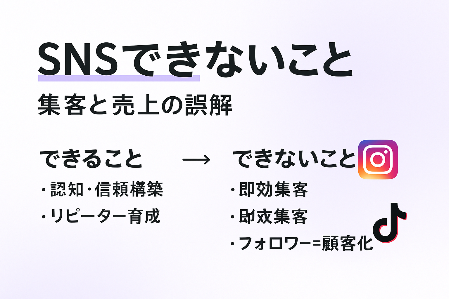 - SNSでできないこと=即効売上UP・フォロワー=顧客化